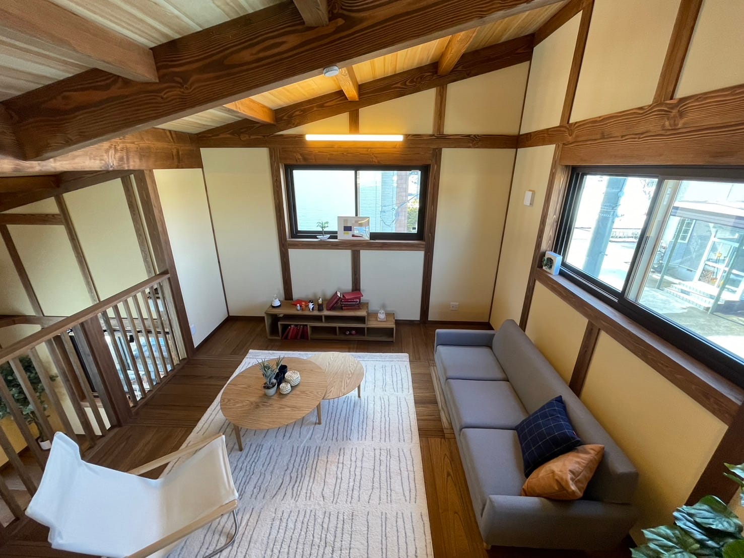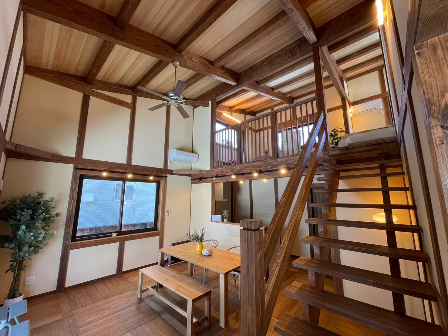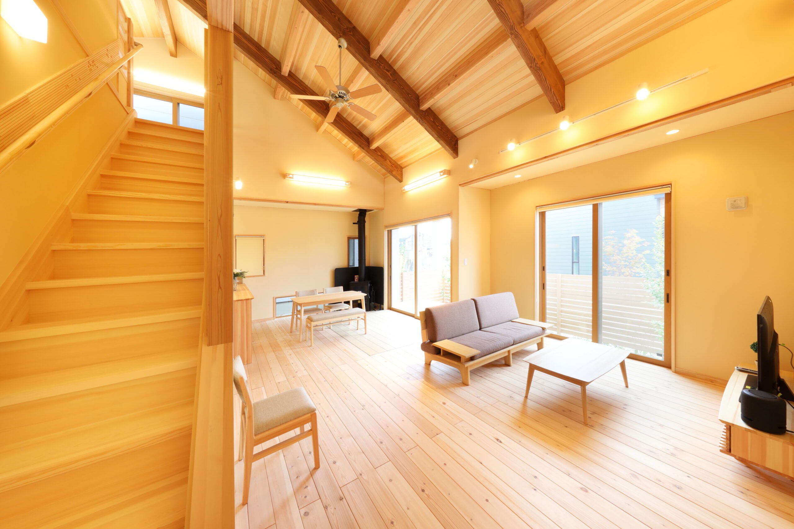 感たっぷりの魅力的な登り梁。グリッドなデザインと高い吹き抜けにより、空間の広さを感