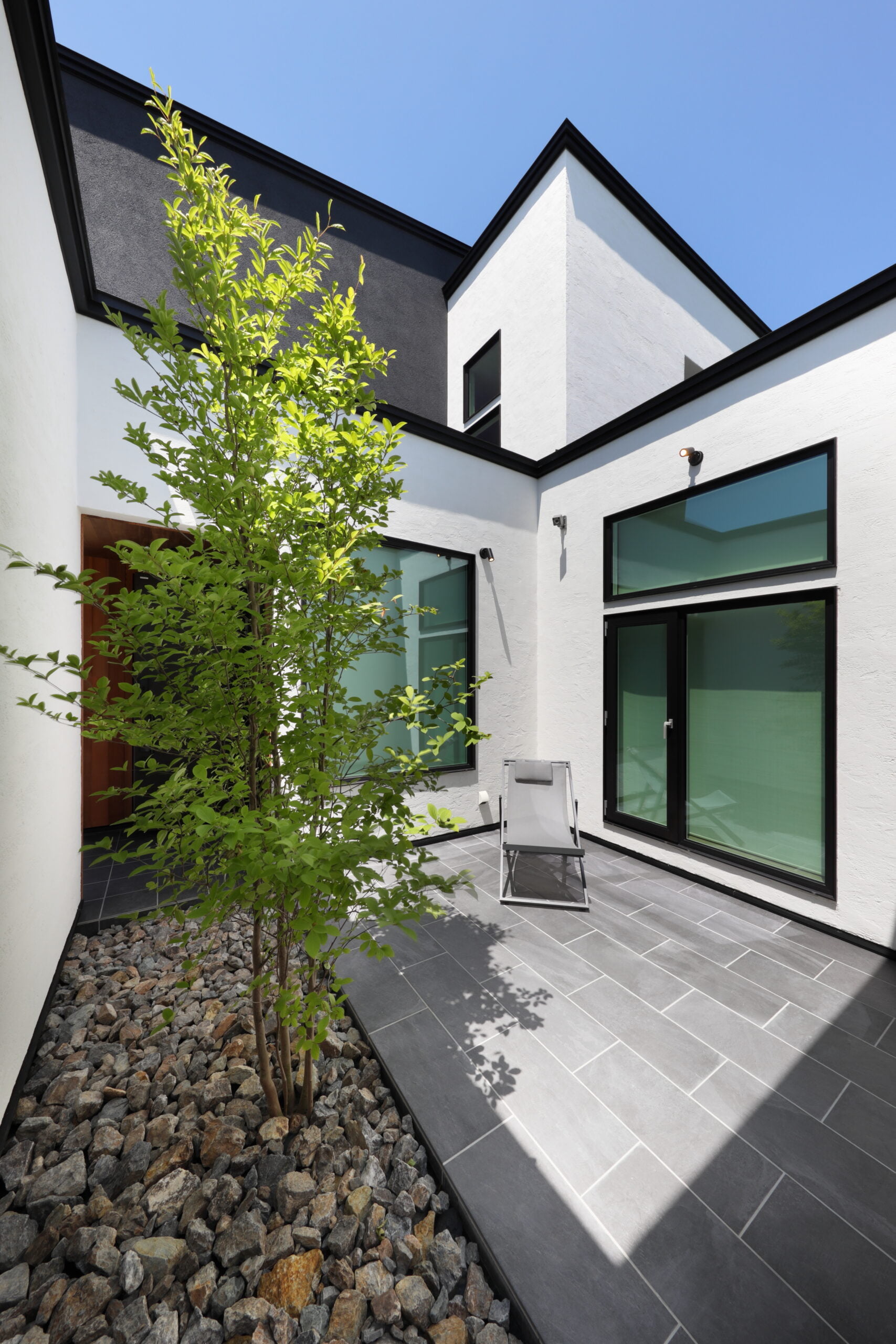 リビングの前にプライベートガーデンをつくり、縦型ブラインドがなくても周囲を気にせずに過ごすことができます。そこでバーベキューも楽しめます。